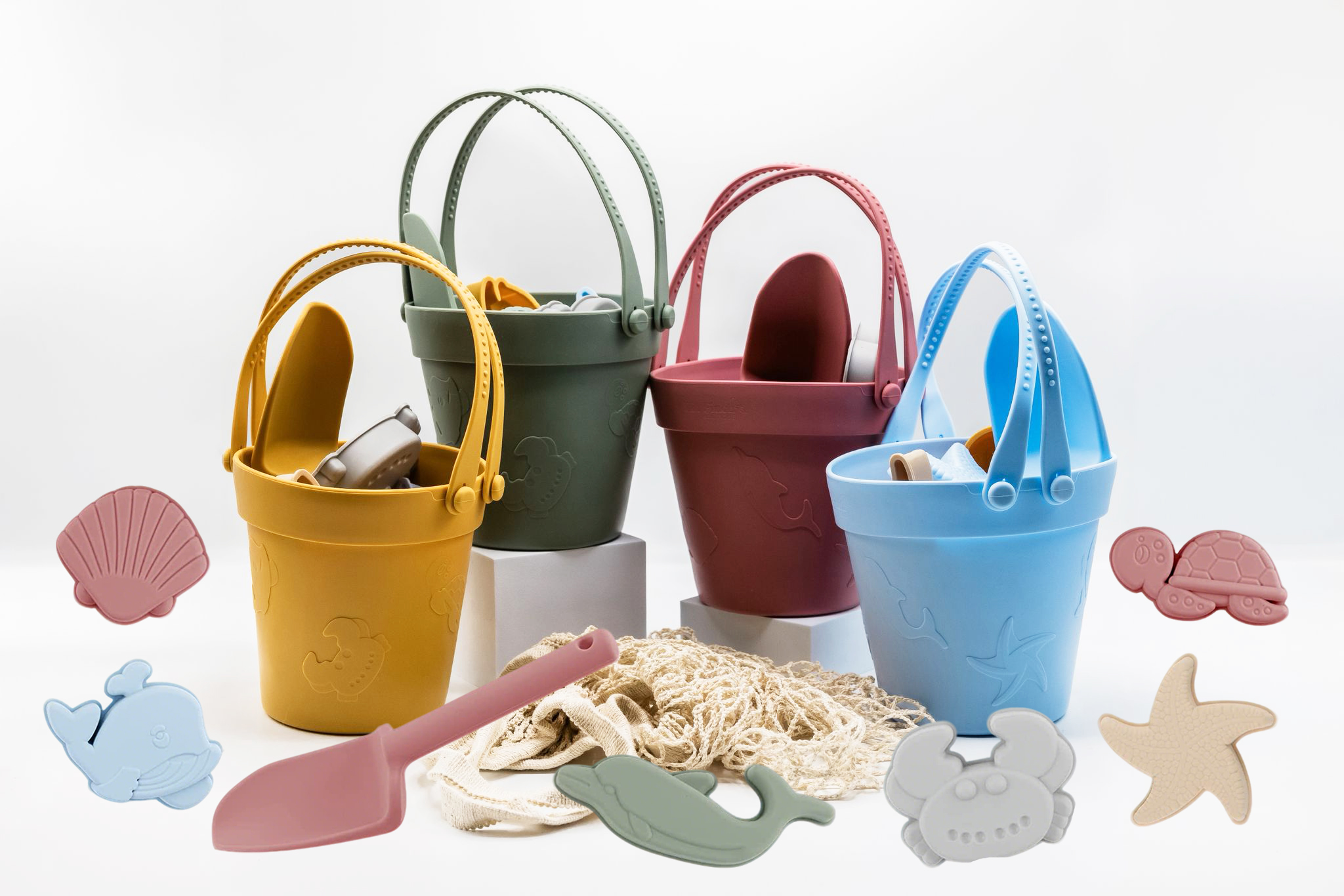 Crește-ți aventurile în aer liber ale micuțului tău cu setul nostru de găleți de plajă din silicon — colecția supremă de jucării de plajă din silicon concepute pentru distracție sigură și fără mizerie.